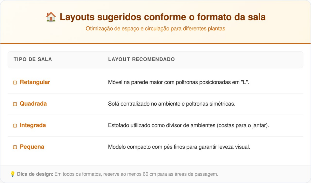 Para que o ambiente não pareça sufocante, é necessário respeitar faixas de passagem específicas ao redor do sofá. O desrespeito a essas distâncias mínimas é o que causa a sensação de aperto, independentemente da metragem real do cômodo.