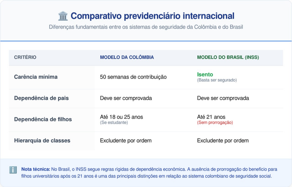 A legislação brasileira é rigorosa quanto à hierarquia, mas não exige um número mínimo de contribuições para que a pensão por morte seja gerada, ao contrário do modelo colombiano. Essa diferença fundamental garante que, no território brasileiro, o benefício seja devido desde o primeiro dia de filiação ao sistema previdenciário.
