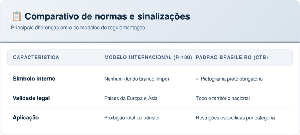 No território brasileiro, toda sinalização de regulamentação deve seguir rigorosamente os padrões estabelecidos pelo CONTRAN. A regra básica exige que o dispositivo contenha um pictograma preto centralizado que informe a natureza da proibição ao condutor.