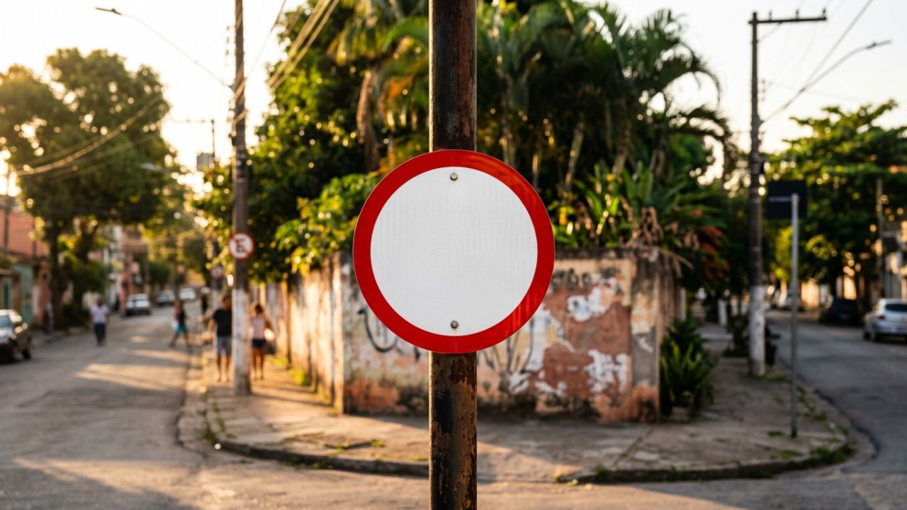 Embora a placa com círculo vermelho sem desenho não gere multas do DETRAN em áreas privadas, o ideal é respeitar a orientação do local. O proprietário pode restringir a circulação de visitantes ou prestadores de serviço por questões de segurança e logística interna.