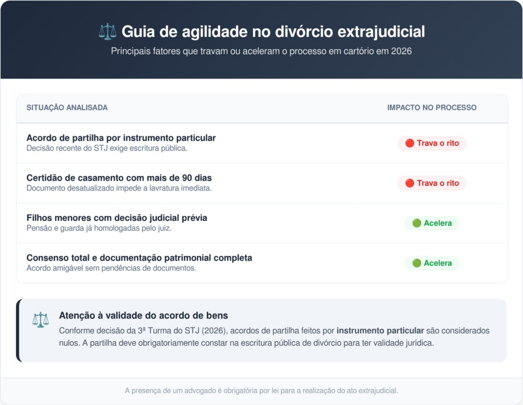 O consenso entre as partes e a regularidade dos documentos são os principais fatores que definem se o divórcio em cartório será rápido ou se acabará travando e indo para a Justiça.