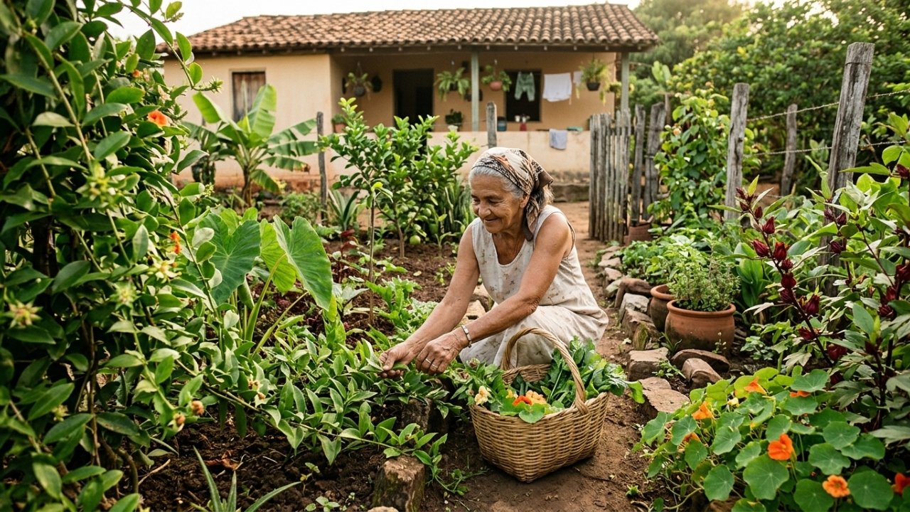 O termo “plantas do quintal da vovó” se refere a espécies tradicionais usadas em chás, sopas, saladas, farofas e remédios caseiros, muitas delas hoje classificadas como PANCs brasileiras – plantas alimentícias não convencionais. São folhas, raízes, flores e frutos que cresciam em espaços pequenos, como fundos de casa, beiras de cerca e canteiros improvisados, sem exigir insumos sofisticados.