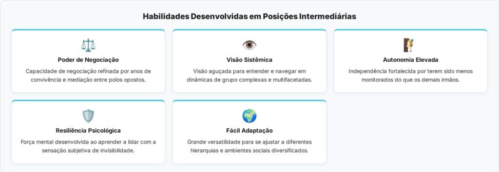 Diferente do primogênito, que frequentemente exerce autoridade, ou do caçula, que costuma ser protegido, o irmão intermediário desenvolve uma empatia cognitiva superior. Eles aprendem a transitar entre diferentes pontos de vista, o que os torna adultos extremamente resilientes e capazes de resolver problemas complexos em ambientes corporativos e sociais desafiadores.