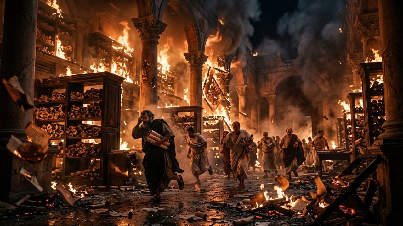 • O grande incêndio durante o cerco militar que consumiu milhares de pergaminhos únicos em poucos dias.