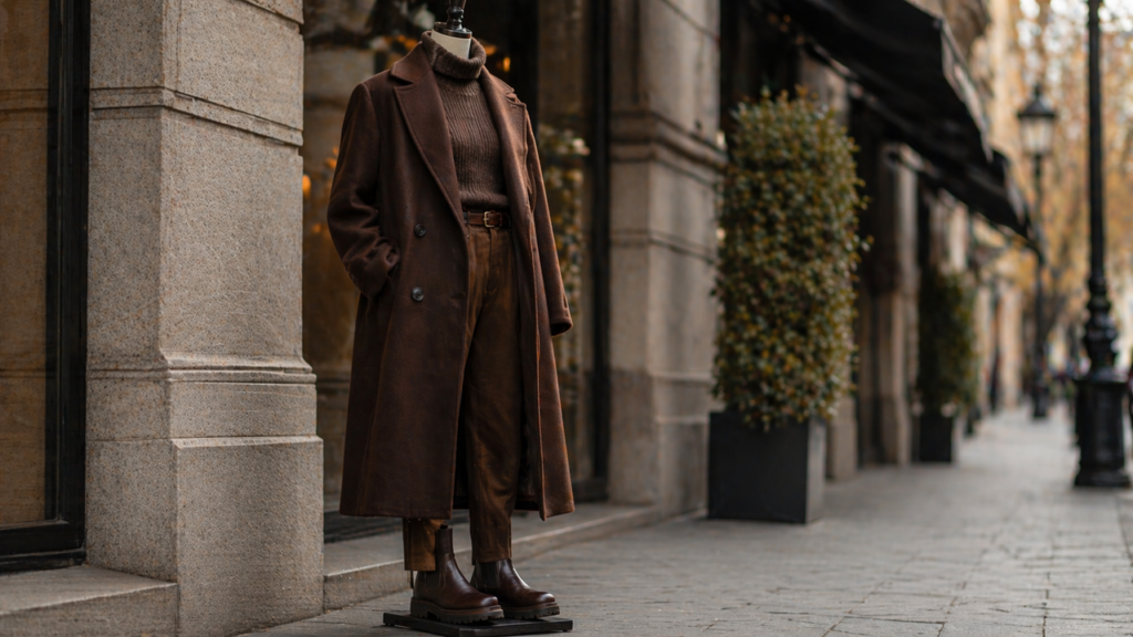 A estética do quiet luxury, focada em peças duráveis, corte limpo e cores atemporais, impulsiona o marrom chocolate como opção ao preto absoluto. Marcas de luxo e grifes urbanas investem nessa cor em casacos estruturados, bolsas rígidas, calçados e alfaiataria para todos os gêneros.