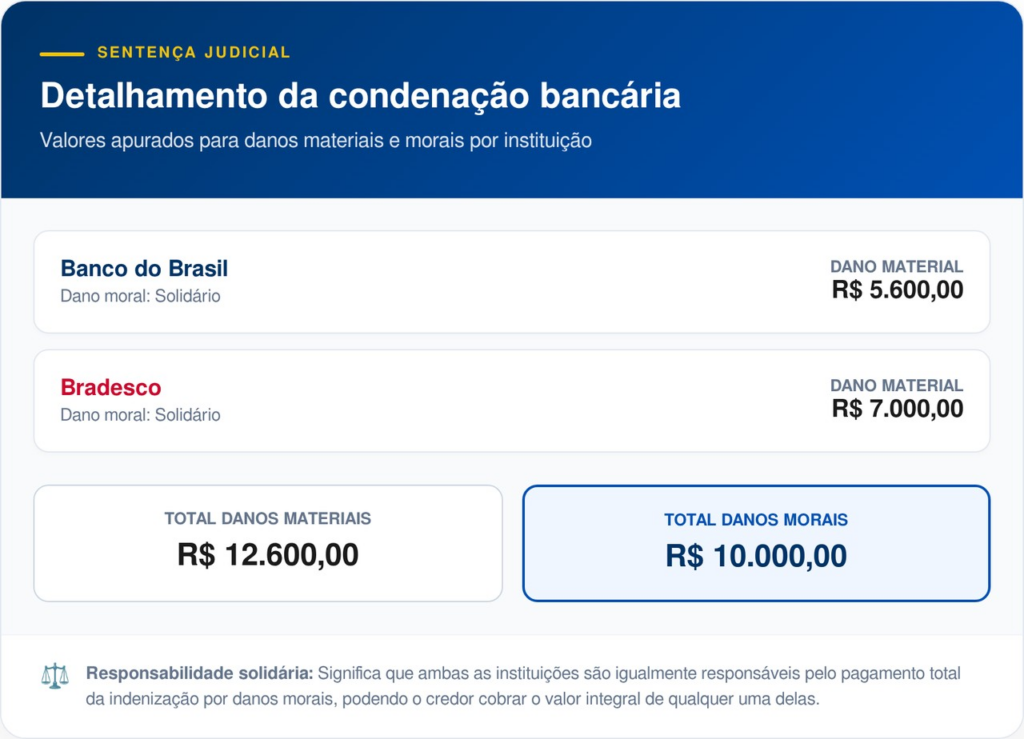 A condenação foi unânime e estabeleceu que os bancos respondem solidariamente pelo dano moral. Essa interpretação jurídica protege o consumidor contra a tese de “culpa exclusiva da vítima”, uma vez que os estelionatários utilizam tecnologia avançada para burlar sistemas de segurança que deveriam ser infalíveis.