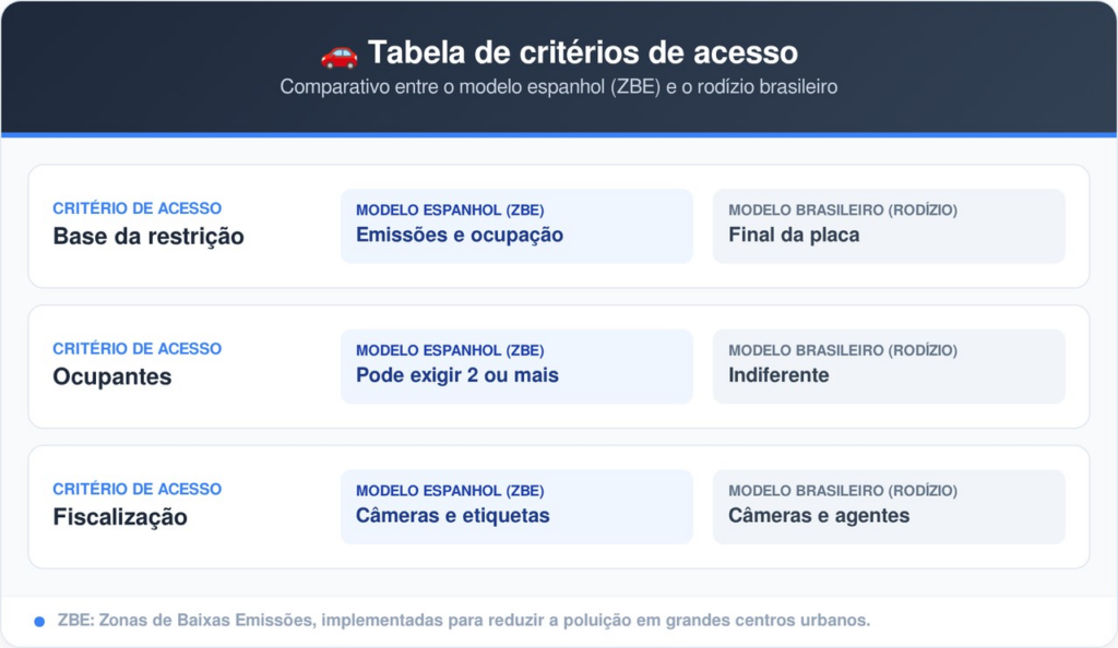 Diferente do modelo europeu, o sistema de trânsito brasileiro não possui previsões legais para restringir o acesso a vias públicas com base no número de passageiros. Atualmente, a gestão do tráfego urbano é baseada estritamente na identificação das placas e no rodízio de veículos em grandes metrópoles.