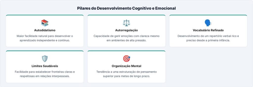 A habilidade chave identificada pela psicologia é a autossuficiência cognitiva, que permite ao adulto lidar melhor com a solidão e projetos complexos. Por passarem mais tempo em contato direto com o vocabulário e os dilemas dos adultos, essas crianças costumam apresentar uma maturidade precoce em funções executivas e tomadas de decisão.