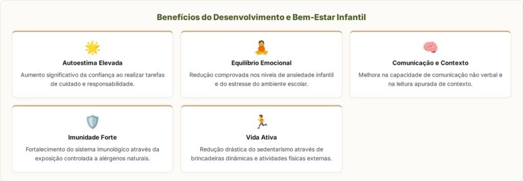 A rotina de alimentação, higiene e passeios estabelece um senso de dever que molda a autodisciplina de maneira lúdica e eficiente. Esse compromisso diário reflete na capacidade de organização pessoal, transformando crianças mais atentas em adultos que cumprem prazos e honram acordos com maior naturalidade e ética profissional.