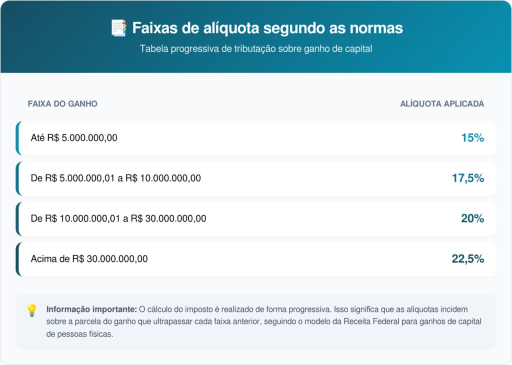 Para quem realiza operações de grande vulto, é fundamental conhecer as alíquotas que incidem sobre o ganho de capital. O cálculo deve ser feito mensalmente e o recolhimento do imposto precisa ocorrer até o último dia útil do mês subsequente à venda.