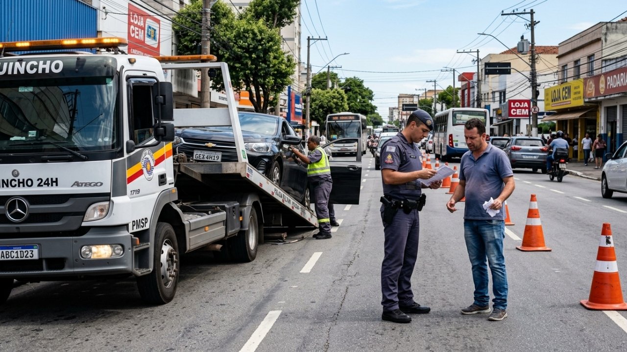 Ao ser flagrado em uma fiscalização, o veículo é levado imediatamente para o pátio da autoridade de trânsito local. A liberação só acontece após a quitação de todos os débitos pendentes, o que inclui impostos atrasados e as taxas operacionais da apreensão executada pela Polícia Militar ou agentes municipais.