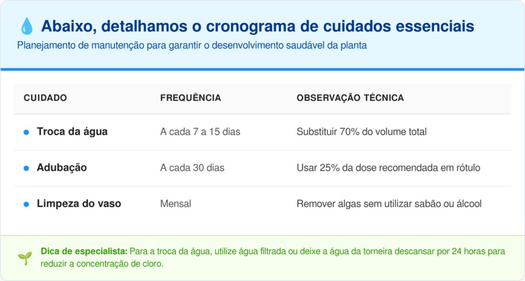 De acordo com orientações da Embrapa, a luminosidade é outro fator crítico, pois o sol direto aquece a água e acelera a decomposição orgânica. O ideal é manter os vasos em locais com luz indireta intensa, garantindo que o ciclo de fotossíntese ocorra sem danificar o sistema radicular exposto.