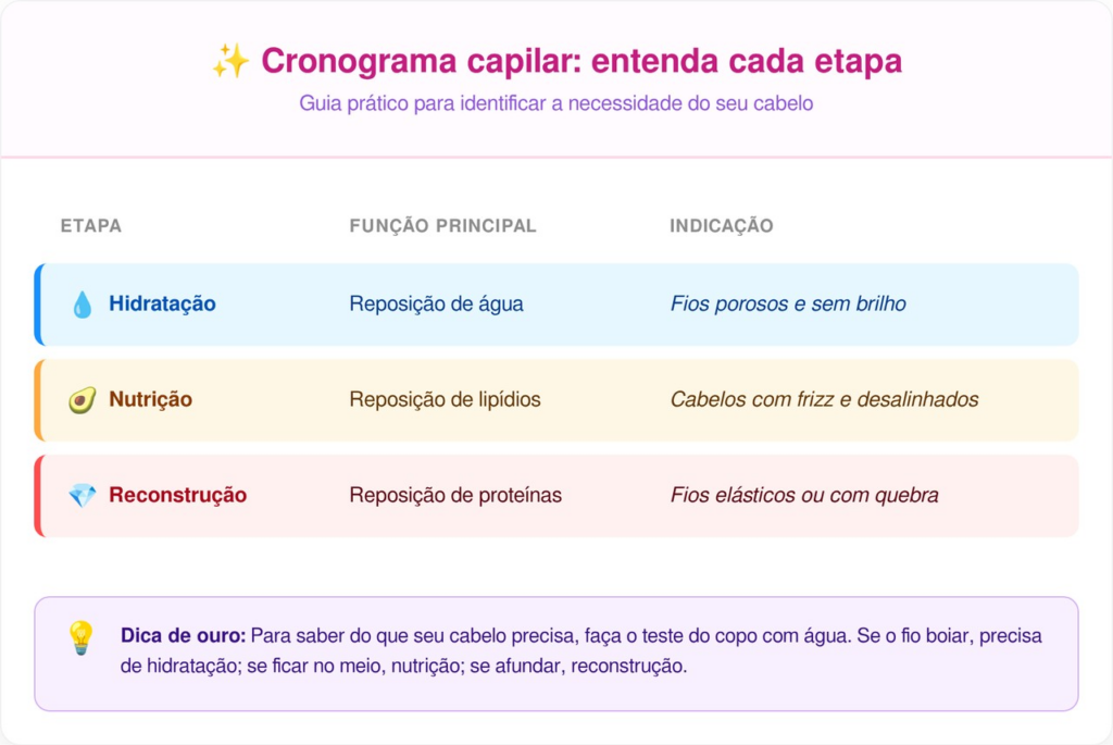 O cronograma capilar divide os cuidados em três funções distintas: hidratação, nutrição e reconstrução. Para quem sofre com o cabelo ressecado pela chapinha, a prioridade deve ser a reposição de água e lipídios para selar as cutículas abertas pelo calor.