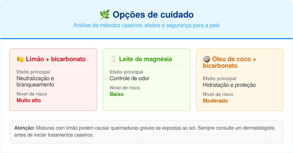 A mistura de limão com bicarbonato de sódio é frequentemente sugerida como uma solução caseira para clarear as axilas ou eliminar odores. No entanto, o uso desses ingredientes requer cautela extrema devido ao potencial de causar danos severos à pele sensível desta região.