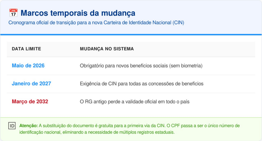 A transição para a Carteira de Identidade Nacional (CIN) gera dúvidas sobre a validade do modelo antigo. Embora o RG atual continue aceito até 2032, o novo cartão de identidade já é exigido para situações específicas em 2026.