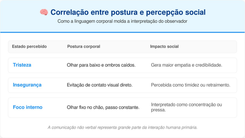 Segundo dados do Repositório UNIFESP, a modificação postural é capaz de alterar relatos subjetivos de emoção. Além disso, pesquisas publicadas na Frontiers in Psychology mostram que a tristeza é percebida com maior intensidade por observadores quando o olhar do sujeito está voltado para baixo.