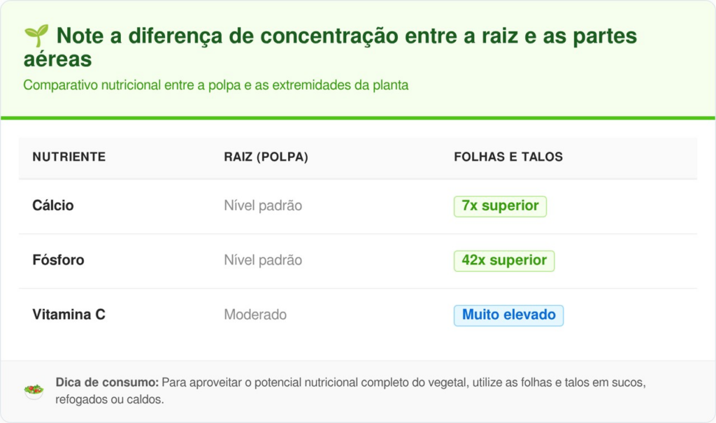 Muitas pessoas ignoram os talos por sua textura firme, mas eles são fontes potentes de minerais. Levantamentos realizados pelo SESI-SP revelam que o talo pode conter até sete vezes mais cálcio do que a raiz roxa que costumamos consumir no dia a dia.