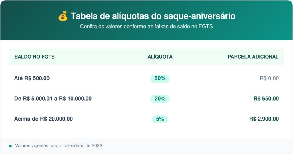 O Saque-Aniversário é uma modalidade opcional que permite ao trabalhador brasileiro retirar parte do seu saldo do FGTS anualmente. Em 2026, os valores podem incluir uma parcela adicional fixa que chega a R$ 2.900.