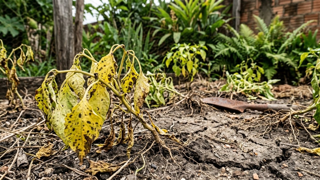 As manchas escuras, bordas ressecadas ou aparência de queimadura nas folhas muitas vezes apontam para falhas na drenagem do solo. Quando a água permanece acumulada por muito tempo, as raízes ficam em ambiente pouco oxigenado, favorecendo fungos, apodrecimentos e estresse que se manifesta na parte aérea como murcha, queda prematura de folhas e necroses.