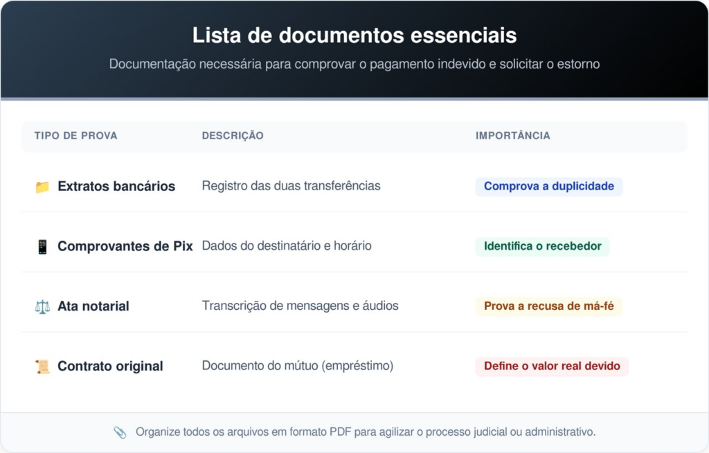 Para vencer a ação, o autor que errou Pix apresentou um conjunto robusto de documentos que comprovaram a origem do erro e a tentativa de conciliação. A ata notarial, documento lavrado em cartório, serviu para registrar oficialmente as mensagens ignoradas pelo réu.