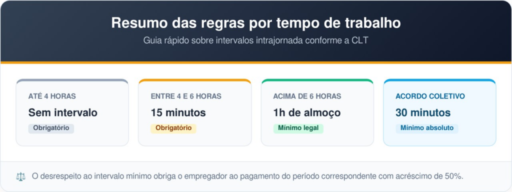 O artigo 71 da CLT estabelece que todo trabalho com jornada superior a seis horas diárias deve ter um intervalo mínimo de uma hora. Esse período é considerado uma norma de saúde e segurança, essencial para a recuperação física do empregado.
