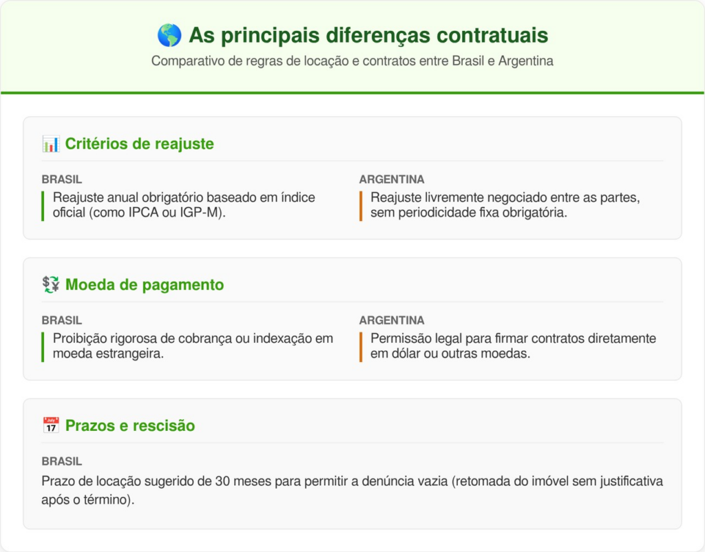 Diferente do país vizinho, o mercado brasileiro segue normas rígidas onde o aumento do valor do aluguel só pode ocorrer a cada 12 meses. O índice de reajuste deve estar estipulado no contrato, sendo o IPCA e o IGP-M os indicadores mais comuns utilizados pelas imobiliárias.