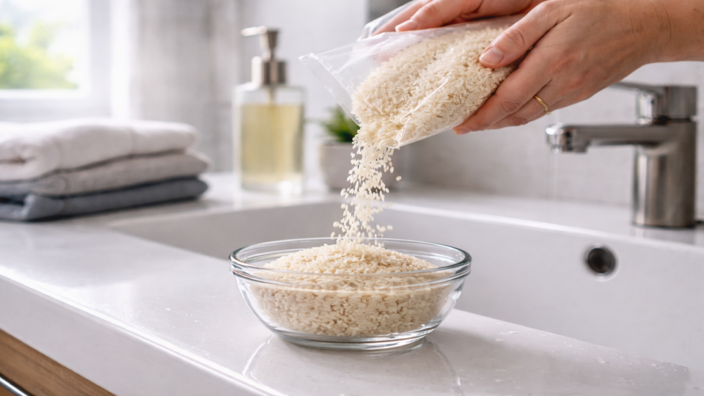 Para aplicar esse truque com arroz cru como absorvedor de umidade, o processo é direto e pode ser adaptado conforme o espaço disponível. O ideal é escolher um recipiente estável, que não quebre com facilidade e que possa ficar em um ponto alto, longe de respingos e do contato direto com a água.