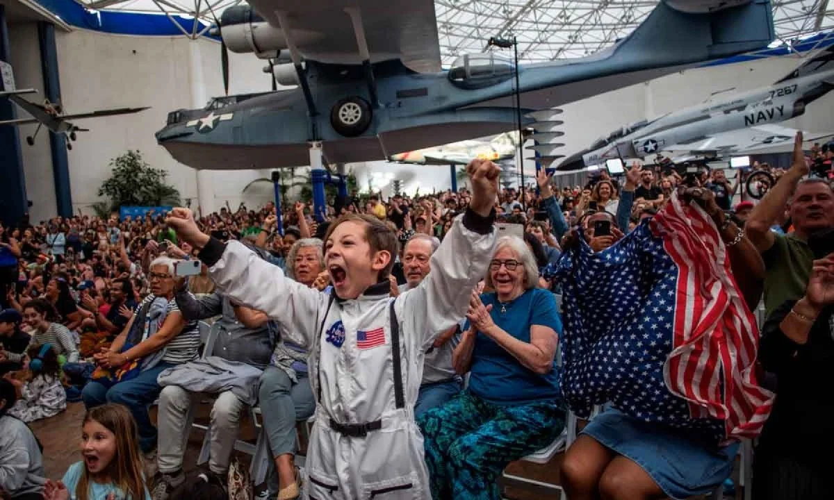 Garoto fantasiado de astronauta comemora enquanto acompanha, em telão, o retorno da missão Artemis II à Terra, durante evento no Museu Espacial, na Califórnia, que reuniu público para assistir ao pouso da cápsula no Oceano Pacífico