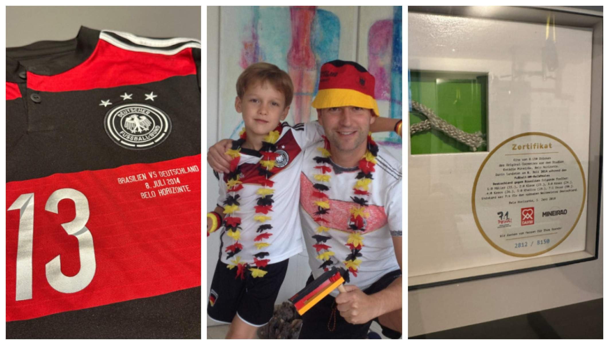 A afeição de Ueckert pelo 7 a 1 é tamanha que o advogado guarda um tesouro inusitado na sua coleção de objetos futebolísticos. Emoldurada numa placa está uma “fatia” do Mineirão. “Ganhei um pedaço da rede de presente de um amigo, que a comprou em uma espécie de leilão filantrópico. Ele sabia o valor que eu daria àquele objeto. Também tenho a camisa oficial do jogo, com o número 13 do Thomas Müller e a referência à cidade de Belo Horizonte”, contou, à reportagem de No Ataque.