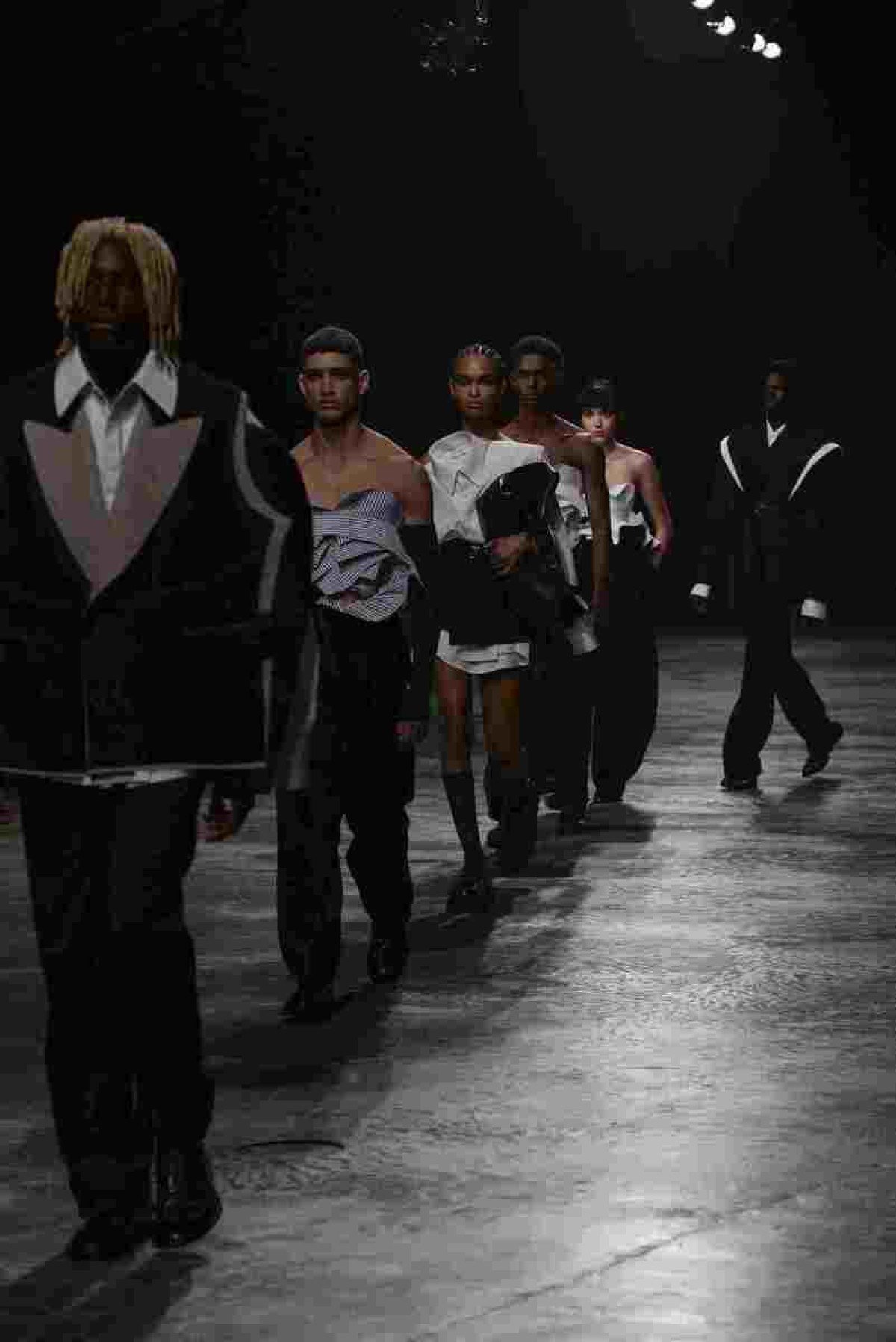 Entre os estreantes, Mateus Cardoso chegou trazendo frescor à alfaiataria. Peças com ombros largos, looks com deslocamento de camisa ou moldes de paletó para a frente do corpo aliados a cortes precisos e bom acabamento elevaram o nível da apresentação.