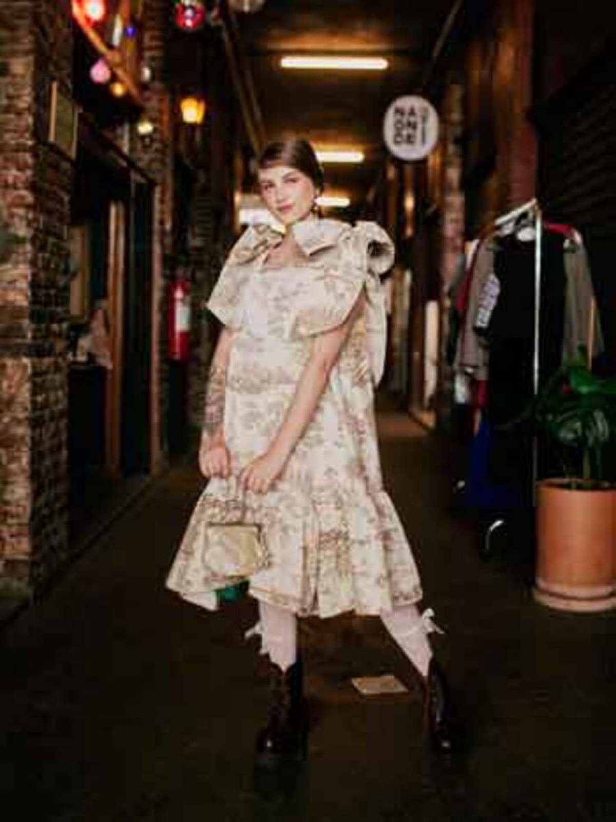 Podemos falar também do vestido de tapeçaria com um enorme laço de organza nas costas e do vestido midi com babados na barra e laços nada discretos nos ombros.