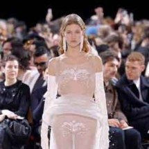 Sob o comando do diretor-criativo John Galliano, Maison Margiela encerrou a Semana de Alta-Costura com um show que chamou atenção pela pegada performática. A principal inspiração para o novo trabalho foi o artista Brassaï, fotógrafo húngaro que marcou o universo do fotojornalismo por meio de imagens da capital francesa nos anos 1930. Margiela apresentou de forma provocativa as formas do corpo humano. A silhueta de cintura finíssima à la Belle Époque foi trabalhada principalmente em corsets, enchimentos no quadril e em looks apertados, como se a roupa fosse alguns tamanhos menores do ideal. A transparência dominou, mostrando uma nudez sensual. Rendas, tules e trench coats surgiram com bordados e brilhos, em tons de marrom, preto e cinza.