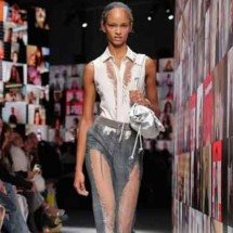 DIESEL - O desfile chamou a atenção. Glenn Martens mostrou maturidade com tratamentos inovadores em jeans e tecidos de jersey. Estampas florais de chita, transparências e pele sintética dominaram a coleção. O jeans e o couro substituíram a alfaiataria clássica.