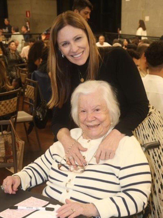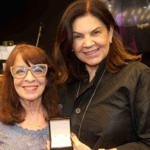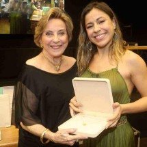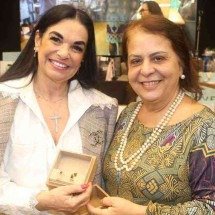 Eliana Bertoldo Melo recebe colar da joalheria Par Par das mãos de Dagmar Henriques