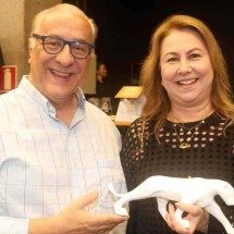 Ricardo Carlini entrega escultura Tigre de Leopoldo Martins para Junia Giannetti