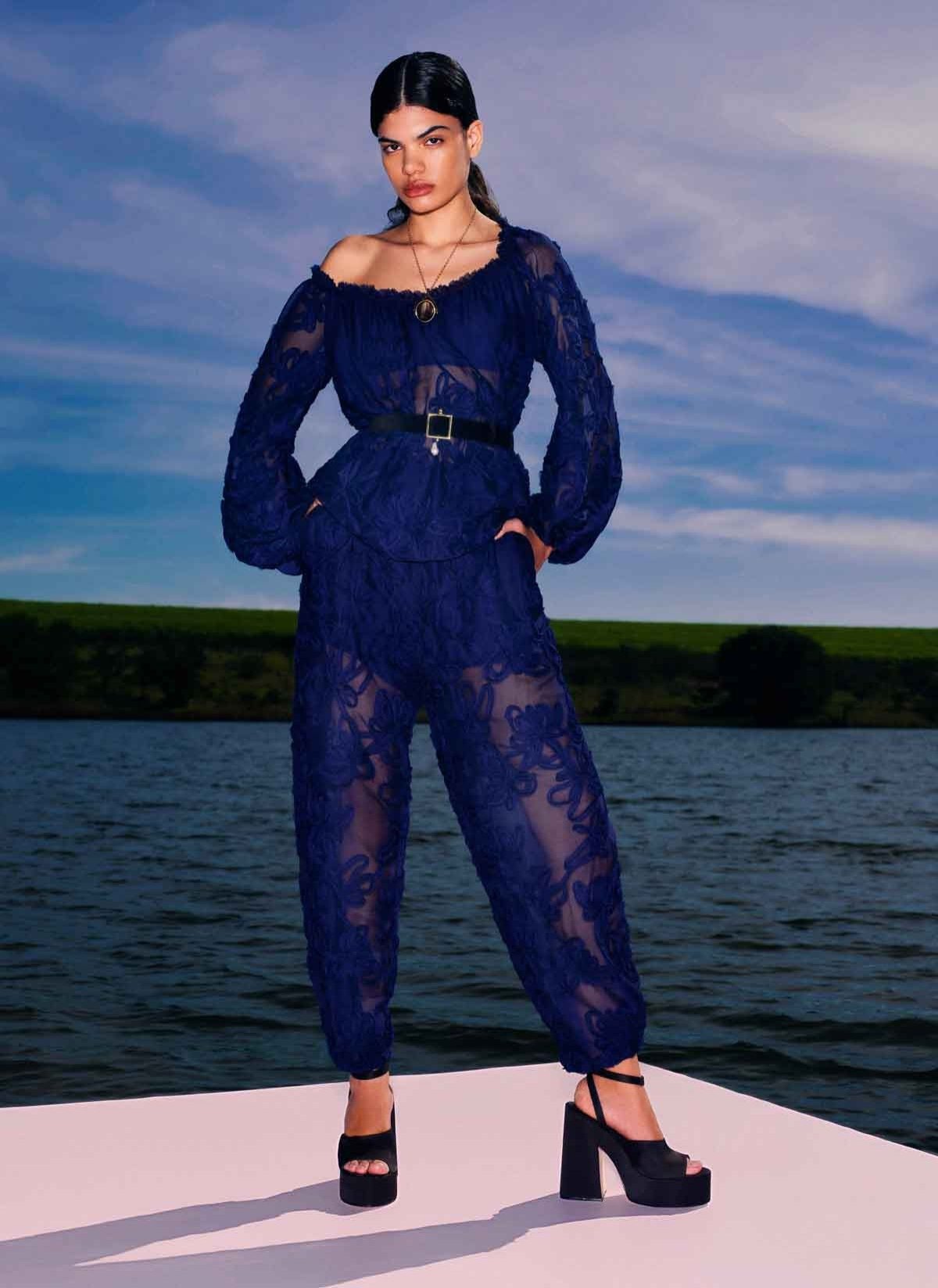 O processo criativo do drop Studio encontra nos tecidos seu ponto de maior expressão. Vestidos, top e saia em tecido transparente com bordados aplicados que recriam a textura de um jardim em movimento ou no tecido Fiore, leve e trabalhado com micro-poás e ramos bordados, enriquecido por fitas que simulam botões de rosas, ou na renda guipure em crepe com bordado em relevo, que cria efeitos tridimensionais.