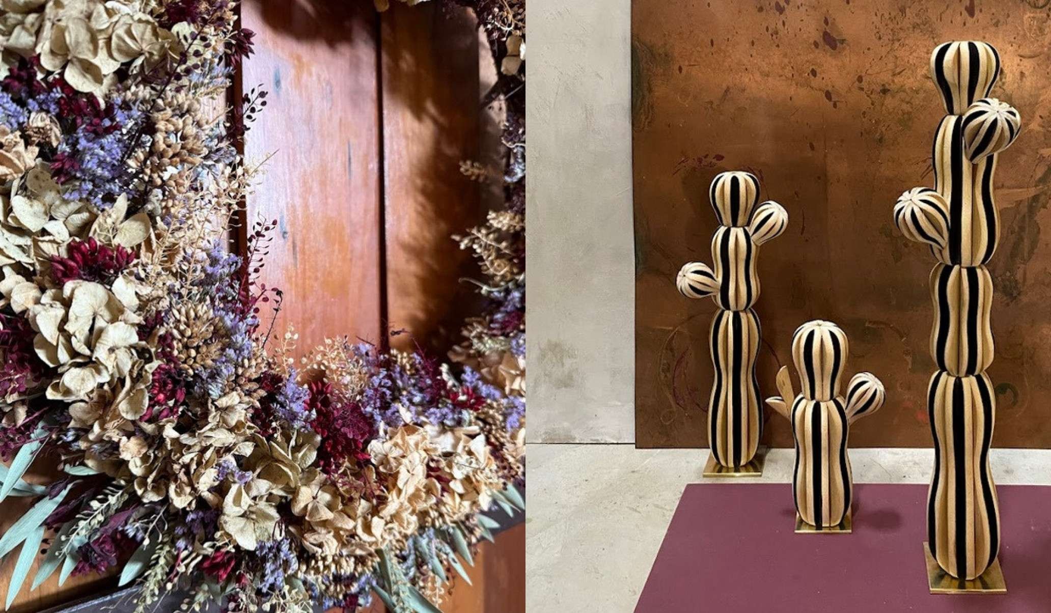 Para enfeitar a porta de entrada, as guirlandas de Liciana Bayer, em seu batismo na Quermesse, são feitas em flores, frutos e folhas preservadas. As flores desidratadas, assim também chamadas, são uma maneira sustentável de se ter flores, sem necessidade de substituição constante, além da alta durabilidade. Liciana as utiliza em estado mais natural possível, criando composições únicas de espécies e cores, imprimindo aos arranjos e guirlandas sofisticação e aconchego.