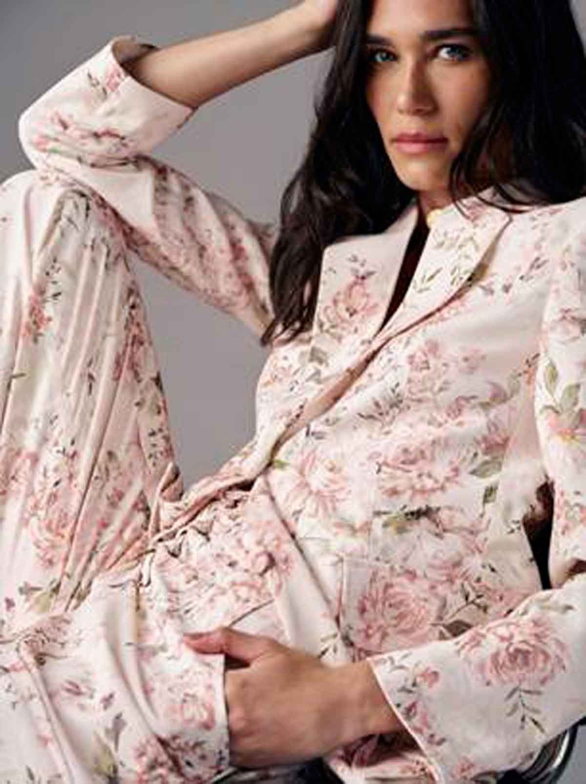 A coleção destaca estampas botânicas reinterpretadas, vestidos de caimento fluido e alfaiataria em vários estilos, desde as lisas até as em xadrez com construção leve, refletindo o tailoring contemporâneo.