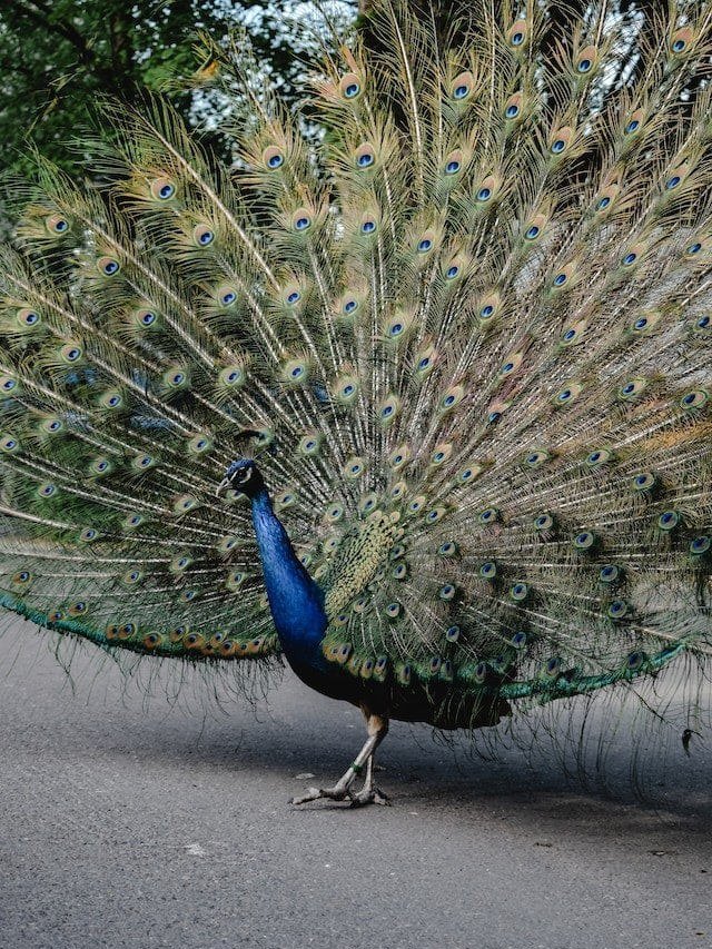 Pavão-Comum- Nativo da Índia. O macho pode pesar até 5,5 kg e medir cerca de 1 metro. Reconhecido por sua deslumbrante exibição de plumagem no ritual de acasalamento - referência de beleza na fauna - o macho abre sua cauda em forma de leque para atrair as fêmeas. Foto: Imagem de Daniel Borker por Pixabay -