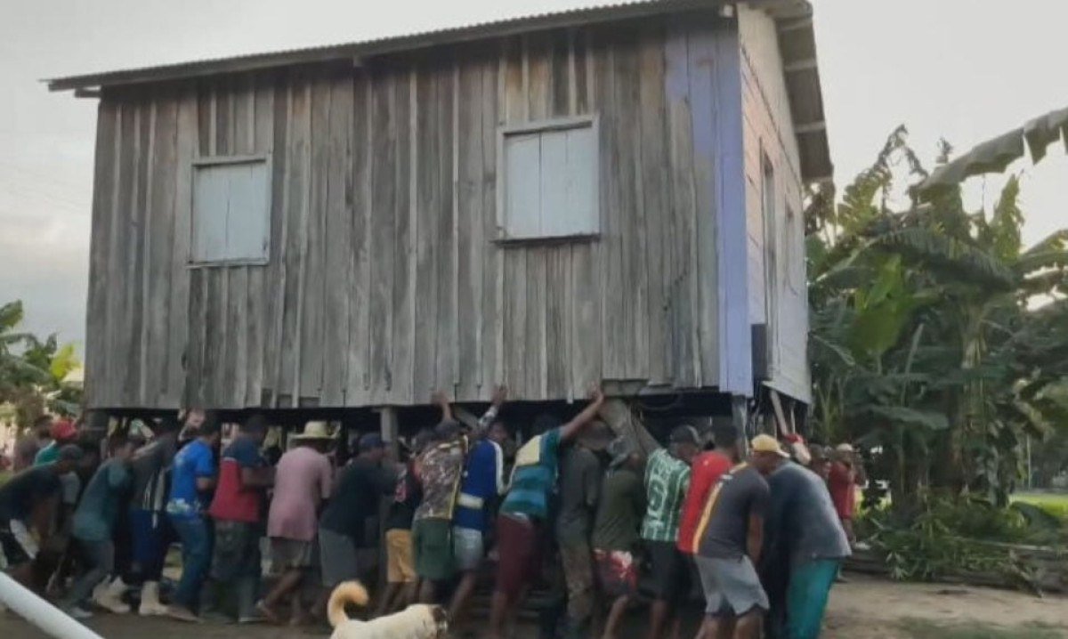 Eles se juntam em grandes grupos e carregam as casas com os braços, erguendo o imóvel e fazendo o transporte enquanto gritam, em coro, para dar a direção certa. Foto: Reprodução TV Globo -