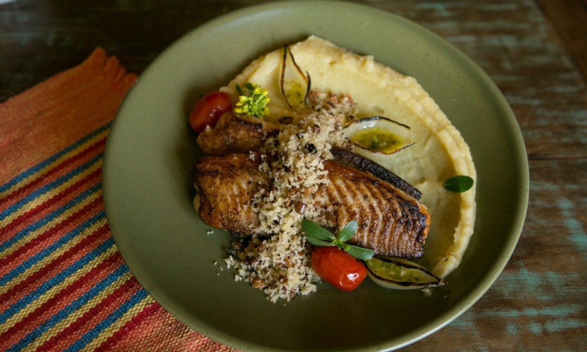Benedito Gastrobar Tilápia do Cerrado com purê de batata-doce, farofa de baru e vinagrete de mel Foto: Prefeitura de Nova Lima/Divulgação -