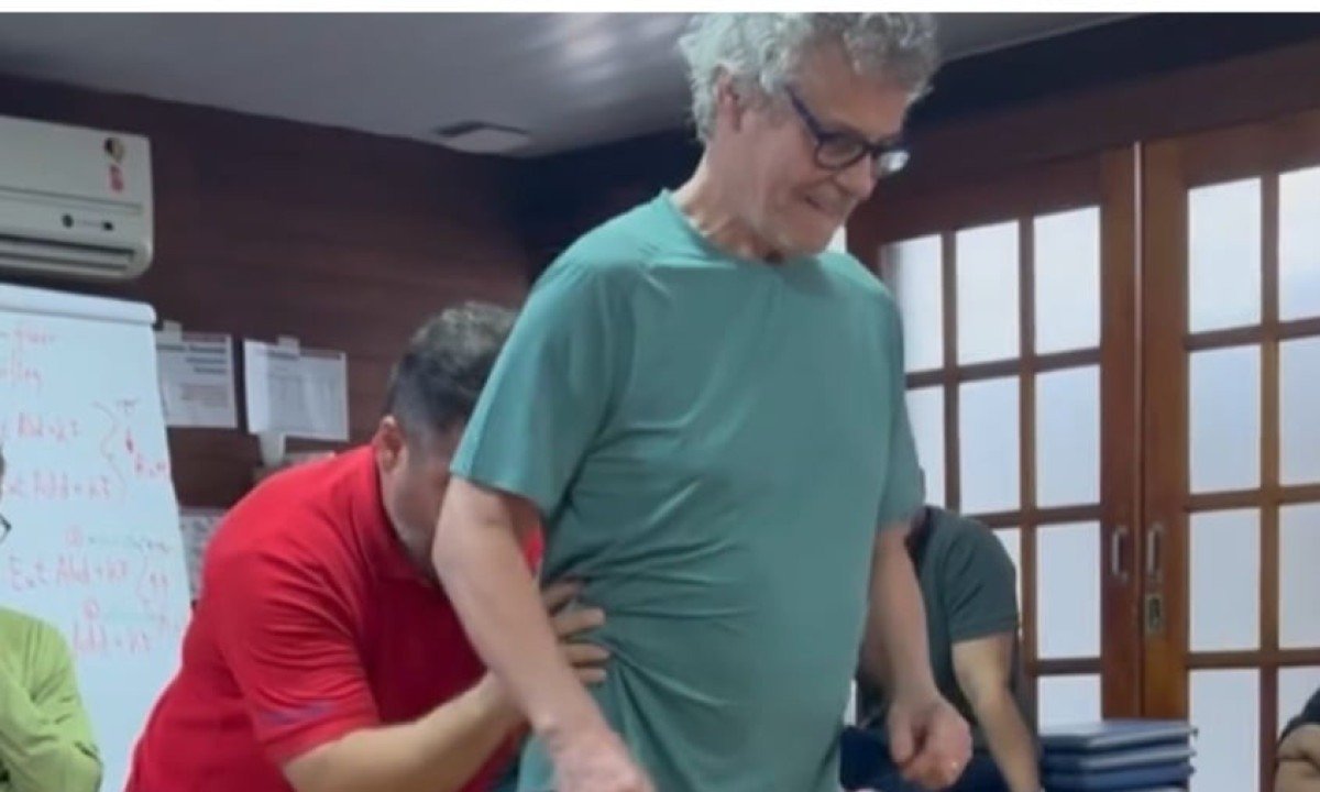 No video, com a ajuda de um profissional, Carlinhos conseguiu ficar de pé e dar alguns passos de samba. Ainda discretos e tímidos. Mas muito importantes para sua recuperação. A fisioterapeuta contou que foi uma grande alegria para todos. Foto: Reprodução de vídeo Instagram -