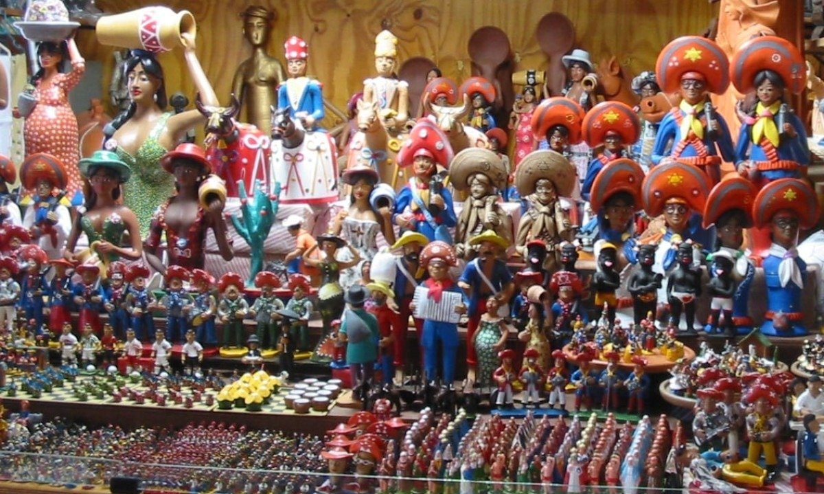 Bonecos de barro - Pernambuco - Os bonecos de barro de Caruaru são ícones do artesanato pernambucano, frequentemente representando figuras de folclore e cenas do cotidiano nordestino. Eles são moldados artesanalmente, refletindo a cultura e as tradições da cidade, especialmente durante as festividades de São João. Foto: Ministério Público de Pernambuco wikimedia commons -