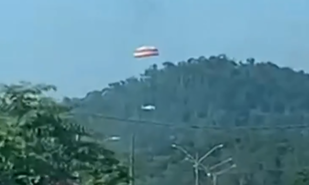 Com o uso do paraquedas, nenhum dos ocupantes se feriu. Os bombeiros foram acionados para o resgate. Seis pessoas estavam no avião: 4 adultos, uma criança de 3 anos e um recém-nascido. Foto: Reprodução de vídeo -