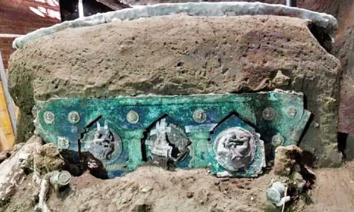 Em 2021 houve uma surpresa. Uma carruagem do tipo Pilentum (usada em cerimônias) foi encontrada, preservada, com quatro rodas, decorações florais e materiais como ferro, bronze e estanho. Foto: Reprodução do Youtube Canal AP Archive -