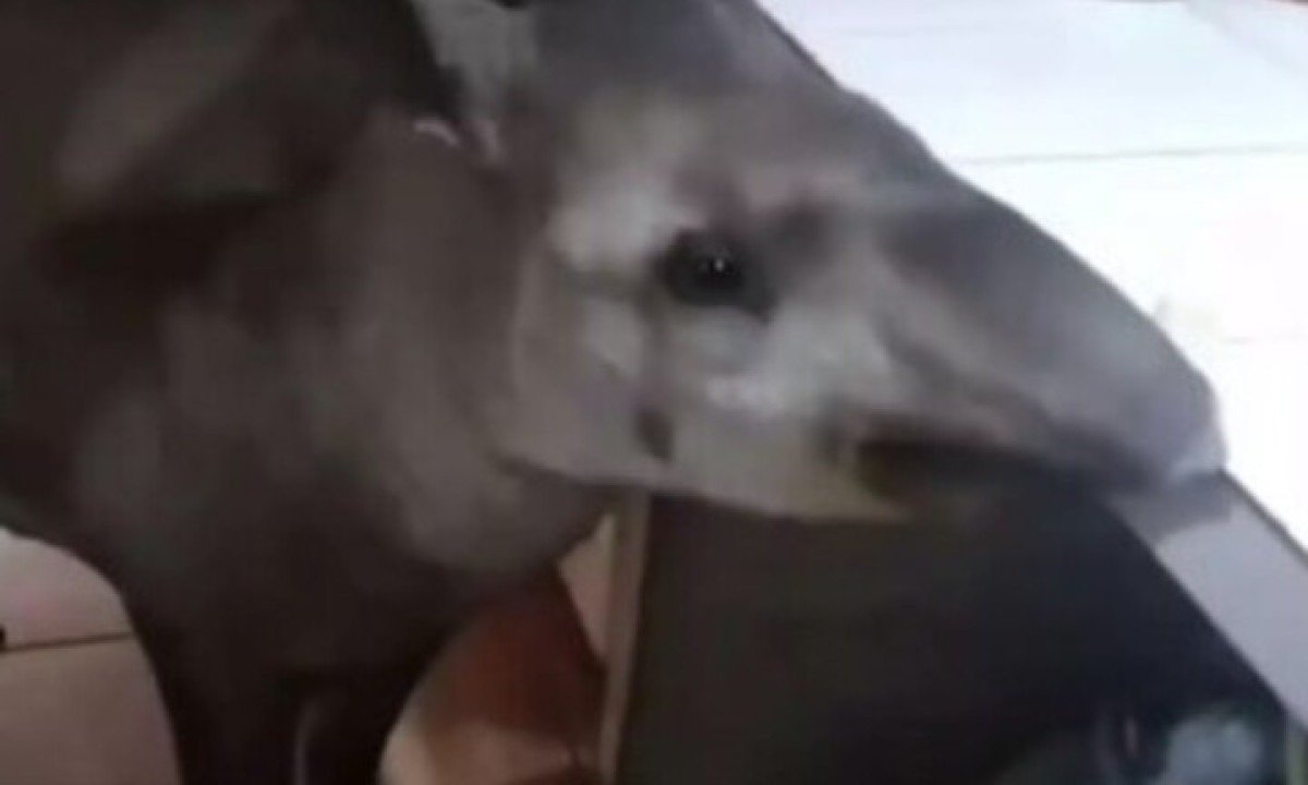 Tico também costuma já entrou em casas para fazer uma boquinha . Em novembro de 2024, viralizou sua imagem da anta dentro de uma residência numa chácara, onde o animal participou de um farto café da manhã. Foto: Reprodução -