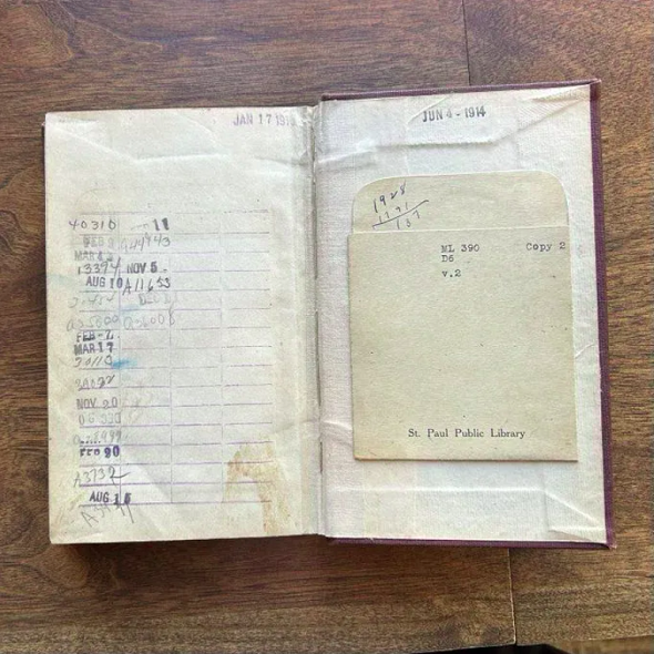 "Compositores Famosos vol. 2", escrito por Nathan Haskell Dole em 1902, foi achado no condado de Hennepin quando um rapaz organizava as coisas da mãe.Ele percebeu que o livro pertencia à biblioteca. Foto: reprodução x -