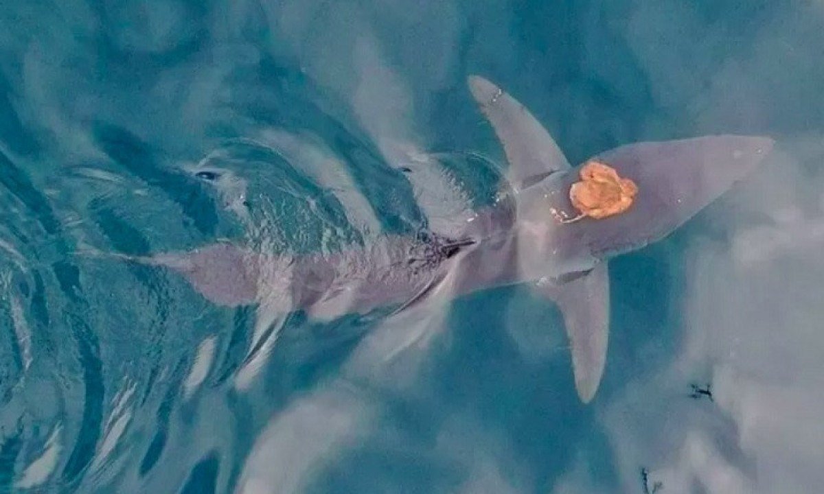 Ela chegou a pensar que fosse um machucado ou até uma boia presa na pele do tubarão. Foto: reprodução -