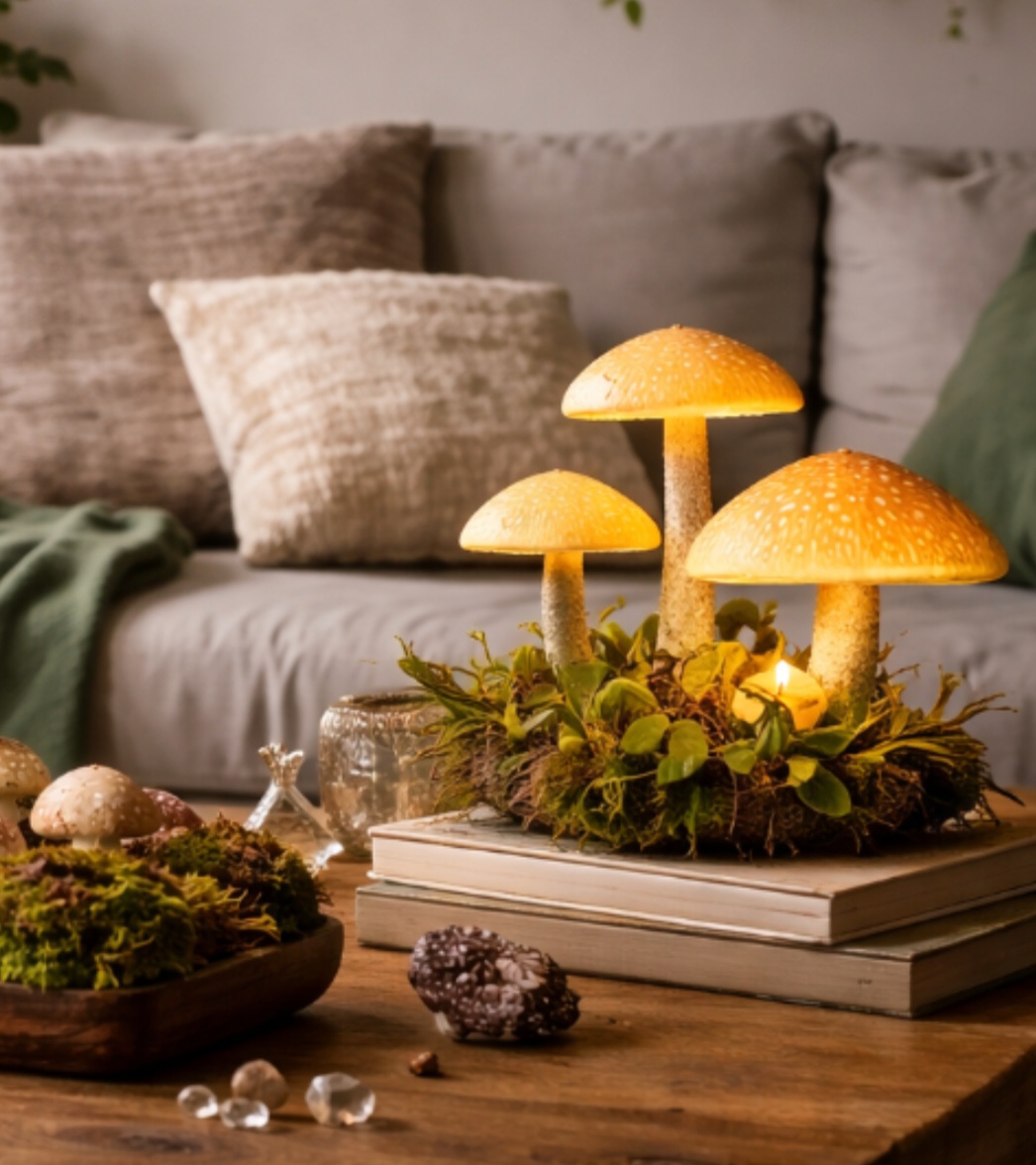 Os cogumelos também conquistaram espaço na decoração: espécies ornamentais e luminárias inspiradas neles trazem um toque natural e místico aos ambientes.