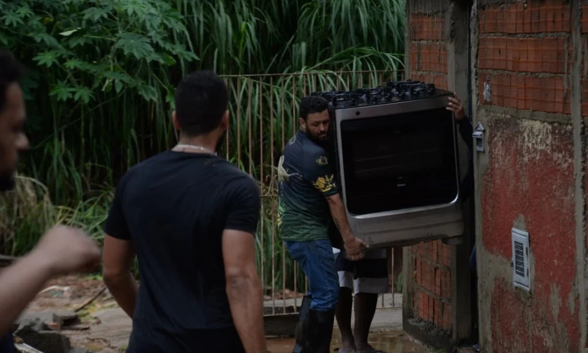 Moradores das áreas de risco tiram móveis e pertences dos imóveis à beira do Córrego Humaitá e nas áreas altas do bairro Jardim Natal